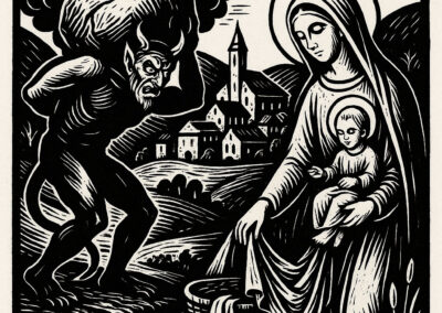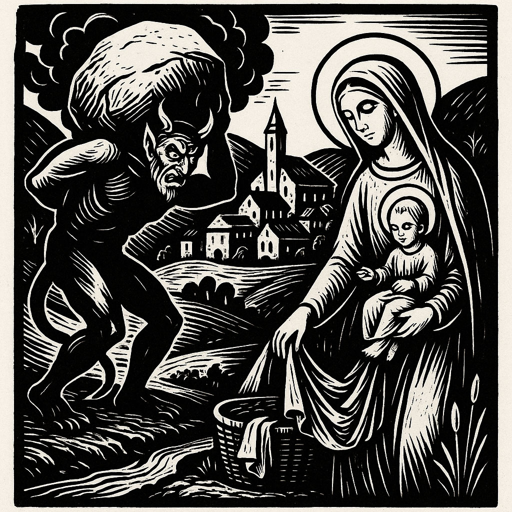 Arrivato su un’altura da cui dominava il paese, posò il macigno per riposarsi un istante prima di scagliarlo contro la chiesa. Fu allora che scorse una donna con un bambino, intenta a lavare pannolini nel ruscello accanto al sentiero. La bellezza della donna lo lasciò senza fiato, ma allo stesso tempo percepì la sua straordinaria forza. La riconobbe subito: era la Madonna con il Bambino. Preso dal panico, il Diavolo tentò di sollevare nuovamente il masso, ma ormai le sue forze lo avevano abbandonato. Per quanto si sforzasse, non riusciva più a smuoverlo. Tremò, imprecò, graffiò la pietra lasciando impressa l’impronta della sua unghia, poi, con un urlo infernale, scomparve in una nube di fumo. La Madonna, con passo lieve, scese al villaggio, dove la gente, ignara del pericolo appena scampato, continuava la recita del Rosario.