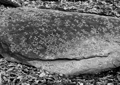 Lungo il sentiero che da Viona porta a Légh, poco dopo l’intersezione con el Riaa dela Pioda, è visibile un masso (320 per 200 per 0/100 centimetri), con numerose incisioni rupestri: el Sass di Cént Crós.